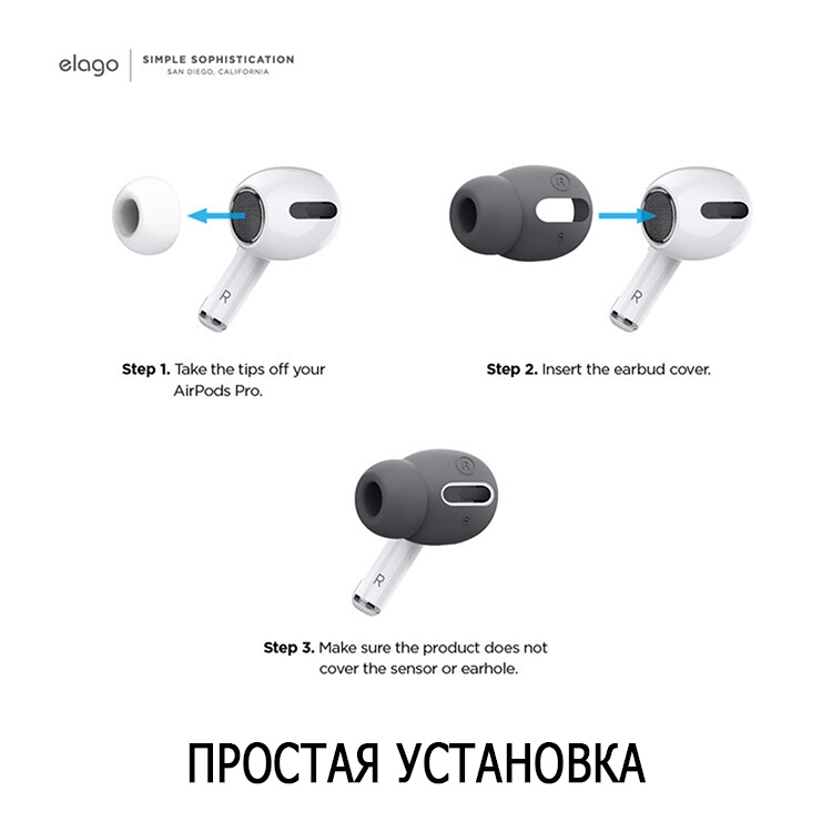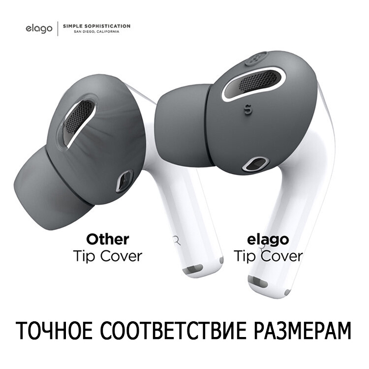Силиконовые накладки (амбушюры) Elago EarBuds Cover обеспечивают комфортное использование беспроводных наушников AirPods Pro на протяжении всего дня. Выполнены из высококачественного гипоаллергенного материала, улучшающего шумоизоляцию и обеспечивающего защиту корпуса от механических повреждений. Надежно фиксируют наушники эйрподс про в ухе, чтобы они не выпали и не потерялись, если их задеть во время занятий спортом, ходьбы или просто отдыха. Толщина 0.2 мм позволяет не снимать накладку с наушников даже при использовании зарядного чехла. Набор состоит из шести пар накладок трех размеров - две пары размера S, две пары размера М и две пары размера L.