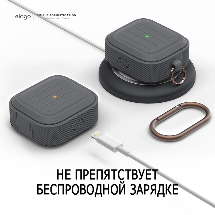 Elago Armor Case - это прочный и удобный силиконовый защитный чехол для зарядного кейса AirPods 3 (2021). Легко надевается, клейкая лента надежно удерживает чехол на устройстве. Также легко снимается и очищается от загрязнений. С помощью карабина его можно закрепить на одежде или ручной клади. Аксессуар с ударопрочными краями защищает зарядный кейс и наушники аирподс 3 от внешних воздействий. Изготовлен из качественного силикона с противоскользящей текстурой. Не препятствует беспроводной зарядке.
