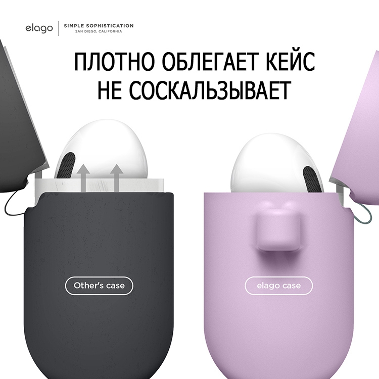 Elago Silicone Hang case - это удобный защитный чехол для зарядного кейса AirPods 3 (2021). Надевается на кейс, точно повторяя его контуры. Защищает от царапин и потёртостей. Изготовлен из качественного тонкого силикона и обладает приятной на ощупь текстурой. Можно закрепить на одежде или на ручной клади с помощью легкого карабина (в комплекте).