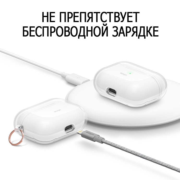 Прозрачный чехол из прочного силикона плотно облегает кейс airpods, при этом сохраняя все его функции. Такой материал отлично защищает от различных царапин, потертостей и прочих повреждений; легко очищается от загрязнений. Перфорированная сетка, расположенная внутри, предотвращает появление конденсата и помогает избежать прилипания чехла к футляру. Модель оснащена алюминиевым карабином, с помощью которого можно прикрепить кейс к рюкзаку или на пояс, тем самым предотвратив его потерю. Для возможности проводной зарядки предусмотрена прорезь для кабеля. Крышка крепится за счет нескользящего покрытия на внутренней поверхности, достаточно просто прижать ее.