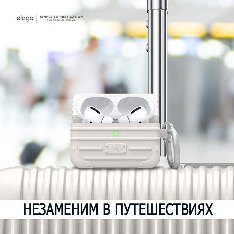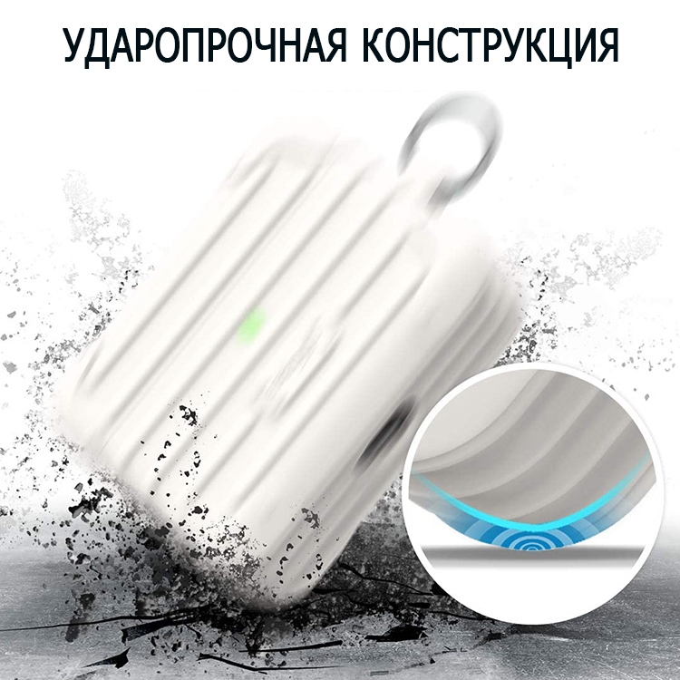 Прочный и удобный силиконовый защитный чехол Elago Suit armor для зарядного кейса AirPods PRO. Легко надевается, клейкая лента надежно удерживает чехол на устройстве. Также легко снимается и очищается от загрязнений. С помощью карабина его можно закрепить на одежде или ручной клади. Аксессуар с ударопрочными краями защищает зарядный кейс и наушники аирподс про от внешних воздействий. Изготовлен из качественного силикона с противоскользящей текстурой. Не препятствует беспроводной зарядке.