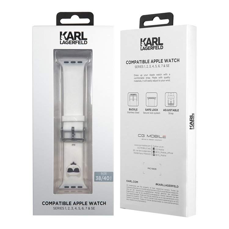 Легкий ремешок Lagerfeld Silicone Choupette head для Apple Watch с размером корпуса 42-41-40 мм. Изготовлен из гипоаллергенного силикона. Надежное крепление, не вызывает неприятных ощущений при длительном использовании. Длина ремешка до крайнего отверстия 15 см, полная длина 18 см.