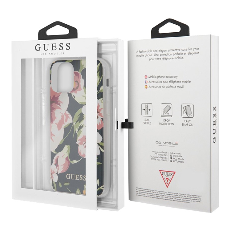 Чехол-накладка Guess изготовлен из пластиковой основы и силиконового бампера, благодаря которому он без труда надевается и снимается. Все отверстия для разъемов, динамиков и камеры выполнены точно и аккуратно, обеспечивая комфортное использование. Боковые клавиши оснащены заглушками, интегрированными в чехол - это защищает их от попадания пыли и влаги. Чехол легко очищается от загрязнений, не препятствует беспроводной зарядке и сигналам NFC. Глянцевая поверхность чехла украшена цветочным принтом и золотистым логотипом Guess.