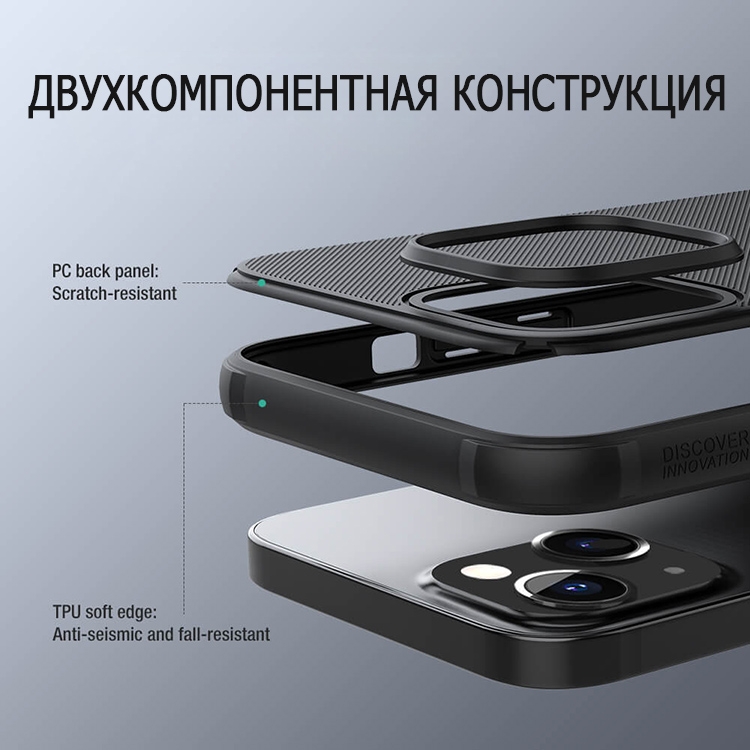 Чехол выполнен в форме накладки из прочного пластика. Обрамлен бампером из пластичного материала: термополиуретана. Аксессуар в точности повторяет контуры телефона, разъемы и кнопки остаются в свободном доступе. Рифленая задняя поверхность с покрытием soft-touch приятна на ощупь и не скользит в руке. Для защиты дисплея боковые грани аксессуара слегка приподняты над экраном айфона.