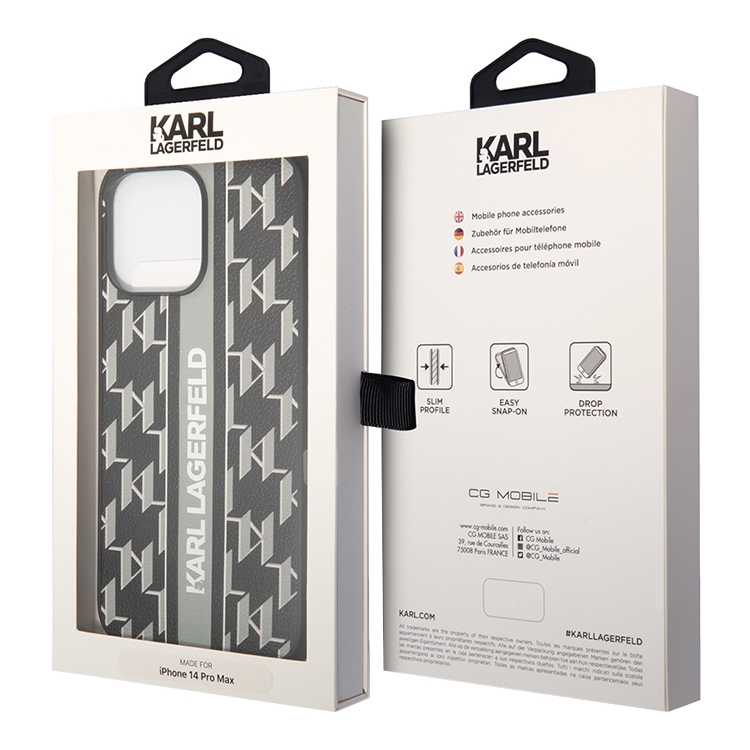 Чехол с монограммой Karl Lagerfeld изготовлен из искусственной кожи, нанесенной на прочную пластиковую основу в сочетании с силиконовым бампером. Выступающие бортики защищают камеру и экран. Клавиши смартфона продублированы специальными накладками, не затрудняющими управление.