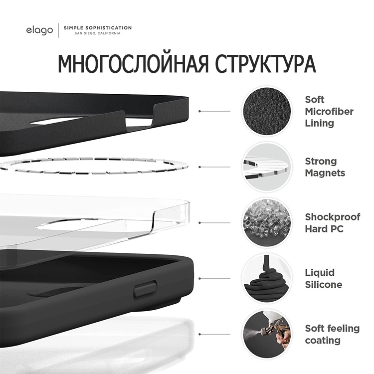 Изготовлен из "жидкого" силикона с покрытием Soft-touch: приятно держать в руке, не скользит. Встроенный магнит позволяет легко прикрепить мобильный телефон к беспроводному зарядному устройству MagSafe или другим аксессуарам. Внутренняя поверхность имеет отделку из микрофибры, нанесенную на пластиковую основу. Боковые клавиши защищены заглушками, интегрированными в чехол - это защищает их от попадания пыли или влаги. Аксессуар плотно облегает корпус телефона, его конструкция отлично защищает от разнообразных повреждений, которые могут быть получены в процессе использования.