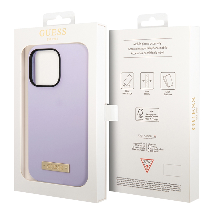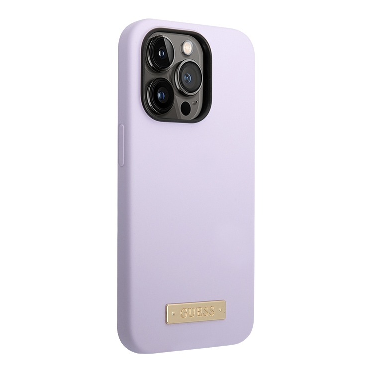 Чехол Guess Liquid Silicone Plate metal logo Hard для iPhone 14 Pro Max, фиолетовый (Magsafe)