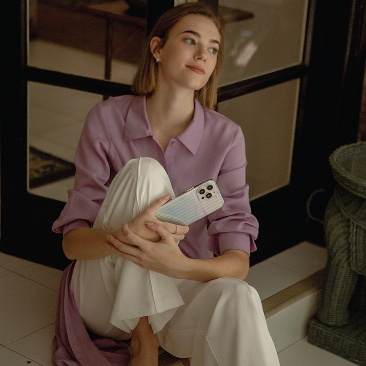 Конструкция корпуса с усиленным бампером надежно оберегает телефон от возможных повреждений, имеет устойчивое к царапинам покрытие. Специальный приподнятый контур вокруг камеры обеспечивает её дополнительную защиту. Полупрозрачная текстура задней поверхности с перламутровым голографическим эффектом меняет цвет под разными углами.