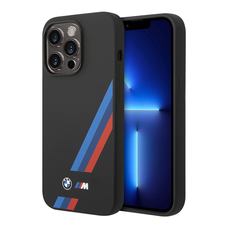 Чехол BMW M-Collection Liquid Silicone Tricolor lines для iPhone 14 Pro, черный