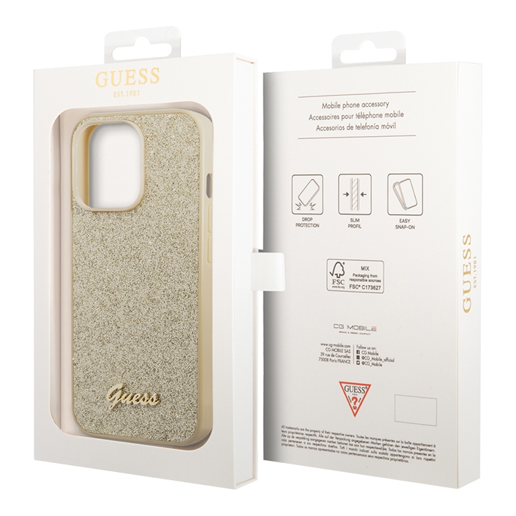 Чехол Guess Glitter flakes w Metal logo Hard для iPhone 14 Pro, золотой