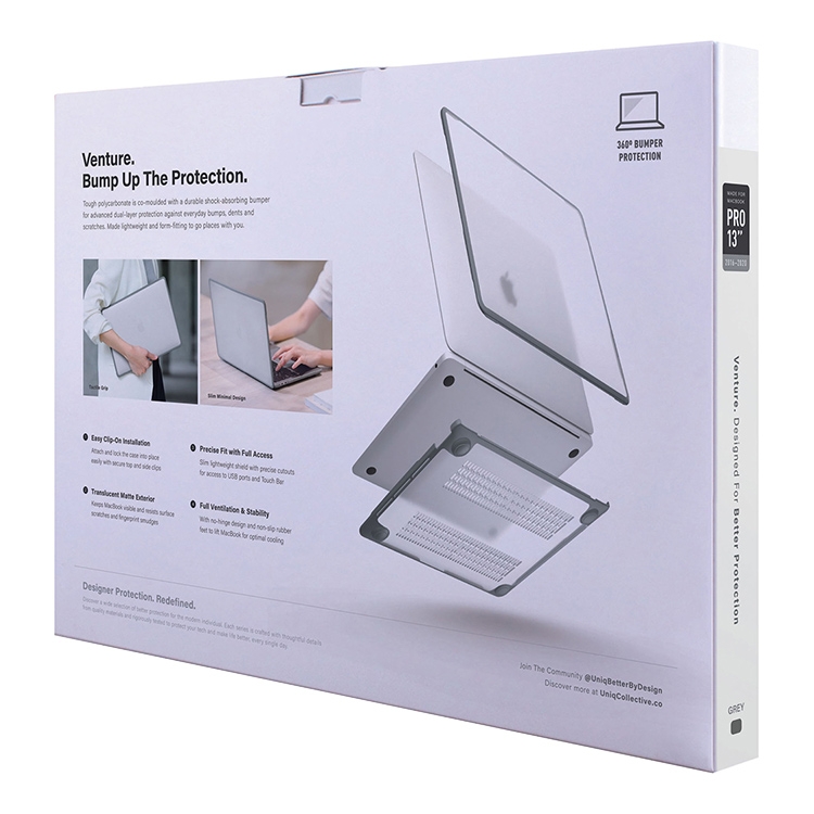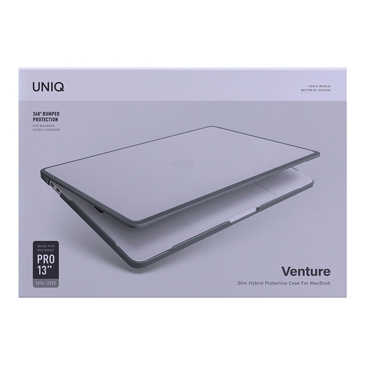 Тонкий и легкий чехол накладка Uniq Venture - это стильная защита от царапин и даже небольших ударов для вашего Macbook Pro 13. Жесткий матовый пластик в сочетании с прочным амортизирующим бампером плотно прилегает к крышке макбука и сохраняет неизменно тонким его профиль. Все порты при этом остаются в свободном доступе, пользоваться устройством будет все так же удобно.