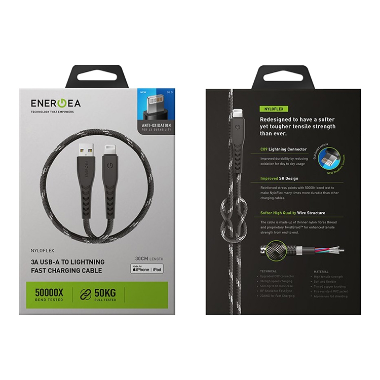Сертифицированный кабель EnergEA NyloFlex предназначен для зарядки аккумулятора Вашего iPhone, iPad или iPod, а также обмена данными между компьютером и Вашим устройством. Прочная конструкция с оплеткой из нейлона и наконечниками из термостойкого пластика устойчива к внешним воздействиям и гарантирует долгий срок службы аксессуара. Родиевое покрытие устойчиво к окислению и обеспечивает высокую проводимость. Выдерживает нагрузку на растяжение в 30 кг и более 30000 циклов сгибания шнура без надломов и повреждения. Смарт-чип C89 обеспечивает более быструю зарядку с защитой от перегрева и перенагрузки.