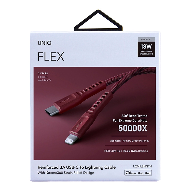 Кабель Uniq Flex предназначен для зарядки аккумулятора Вашего iPhone, iPad или Airpods и передачи данных на высокой скорости. С его помощью вы легко подключите устройство Apple с разъёмом Lightning к порту ноутбука или адаптеру питания c разъемом USB Type C. Надежная конструкция с нейлоновой оплеткой и гибкими коннекторами выдерживает до 50000 перегибов и гарантирует долгий срок службы аксессуара. Прочные материалы не высохнут и не растрескаются со временем, а усиленные соединения коннекторов с кабелем препятствуют образованию изломов. При наличии адаптера питания USB-C Power Delivery мощностью 18 ватт и более поддерживает режим быстрой зарядки.