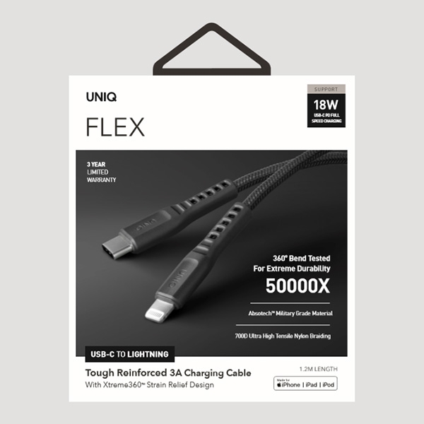 Кабель Uniq Flex предназначен для зарядки аккумулятора Вашего iPhone, iPad или iPod и передачи данных на высокой скорости. С его помощью вы легко подключите устройство Apple с разъёмом Lightning к порту ноутбука или адаптеру питания c разъемом USB Type C. Надежная конструкция с нейлоновой оплеткой и гибкими коннекторами выдерживает до 50000 перегибов и гарантирует долгий срок службы аксессуара. Прочные материалы не высохнут и не растрескаются со временем, а усиленные соединения коннекторов с кабелем препятствуют образованию изломов. При наличии адаптера питания USB-C Power Delivery мощностью 18 ватт и более поддерживает режим быстрой зарядки.