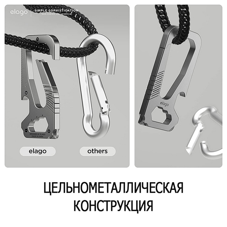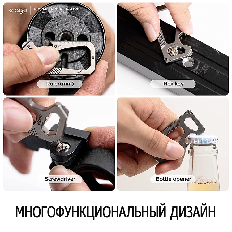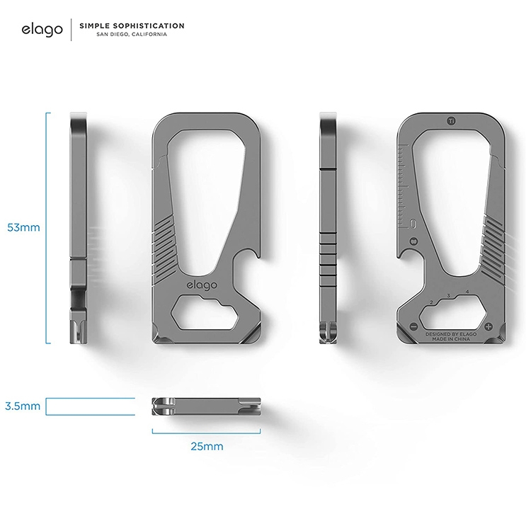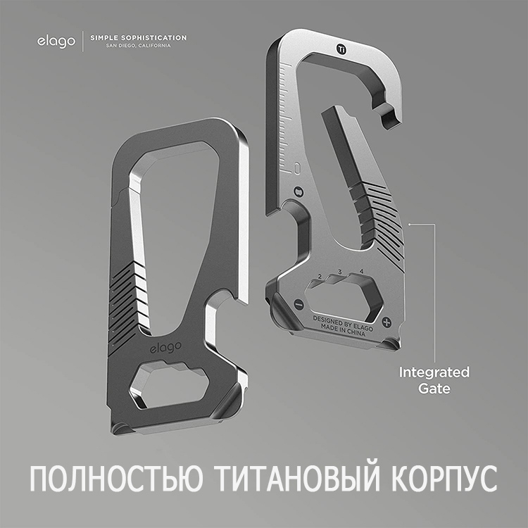 Многофункциональный карабин из титана отличается прочностью, невероятно высоким качеством и прослужит Вам всю жизнь! Цельнометаллическая конструкция с защёлкой, выполненной способом лазерной резки, отличается большой износостойкостью и удобством в обращении. Помимо свого основного предназначения Elago Titanium EDC может выполнять функции открывашки для бутылок, линейки, шестигранного ключа трех размеров и отвертки (с плоской и фигурной головками).