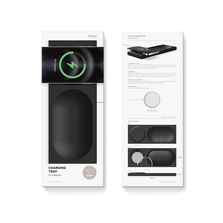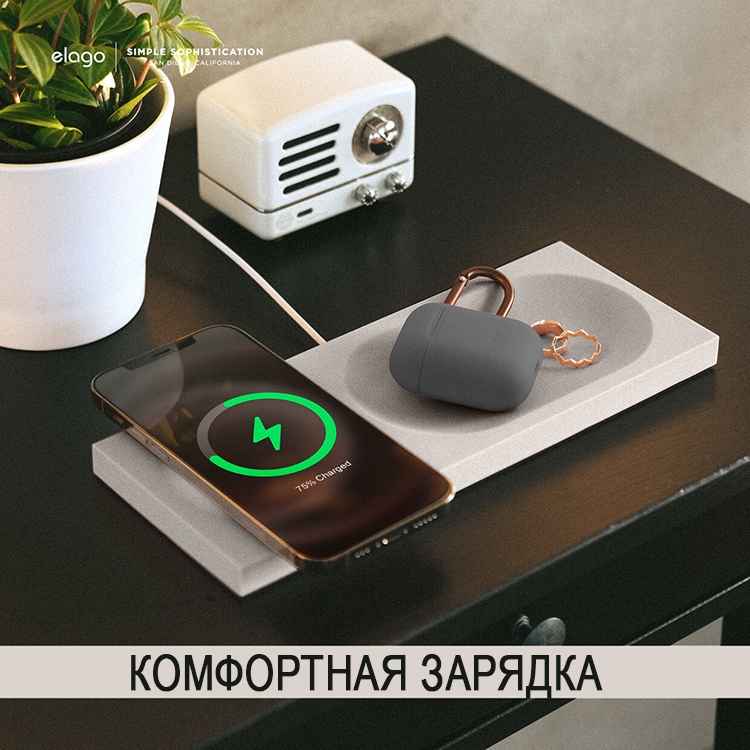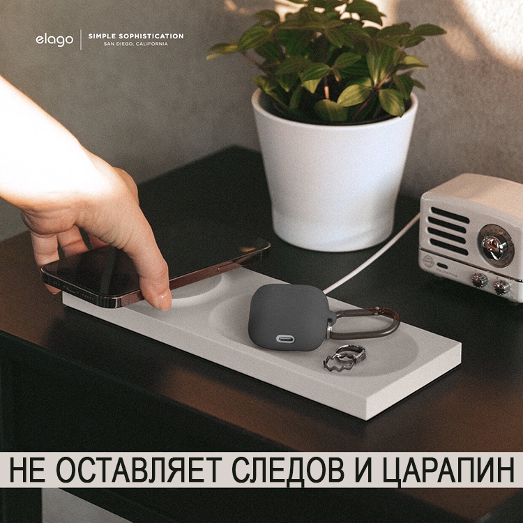 Компактная док-станция Elago Tray поможет зарядить iPhone 12 или любой другой смартфон с поддержкой технологии MagSafe. Гибкая конструкция из прочного высококачественного силикона позволяет легко подключить зарядный кабель к отверстию в корпусе док-станции, не скользит, не оставляет следов, потертостей и царапин на заряжаемых устройствах и на используемых поверхностях. Подставка оборудована лотком для хранения разных мелочей (ключи, кошелек, кольца).