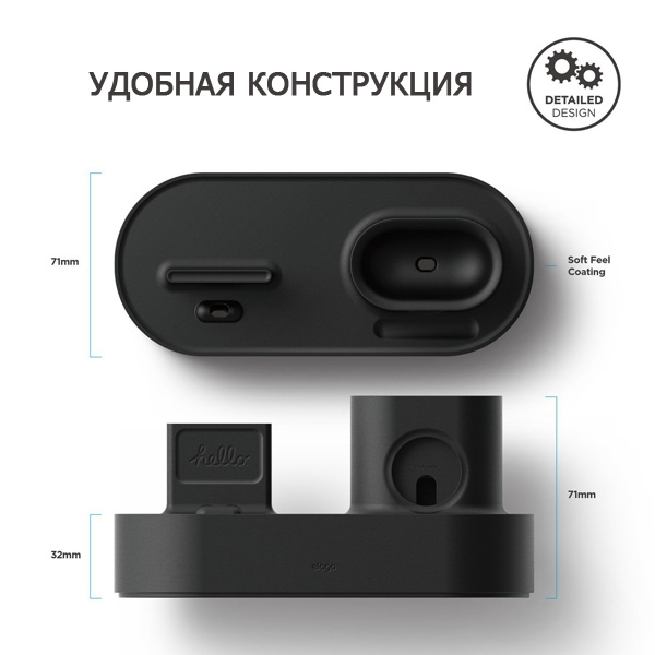 Удобная док-станция Elago предназначена для одновременной зарядки iPhone, AirPods и Apple Watch. Благодаря использованию силикона обладает необычным и стильным дизайном, не скользит и не оставляет следов царапин и потертостей. Собранные в одном месте разъемы обеспечивают простую установку кабелей и экономят пространство. Продуманная конструкция обеспечивает устойчивость зарядной станции и подключенных к ней устройств.
